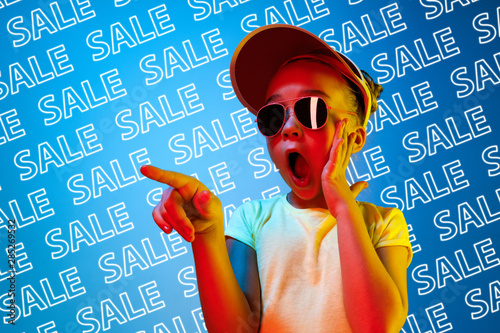 Portrait of young caucasian girl in electric sunglasses cyber monday